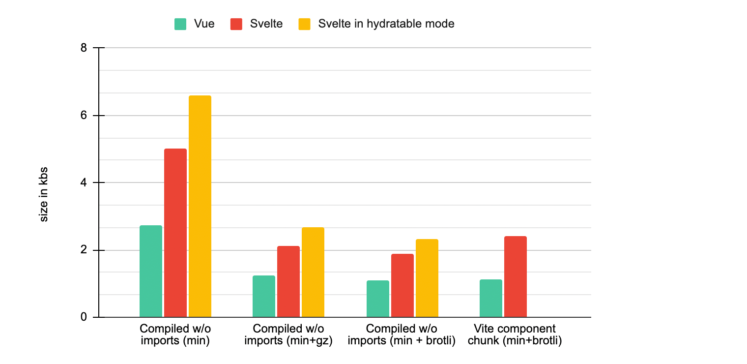 - 编译后的 Svelte 组件代码比 Vue 3 等效代码重70%,在 SSR 模式下重110%