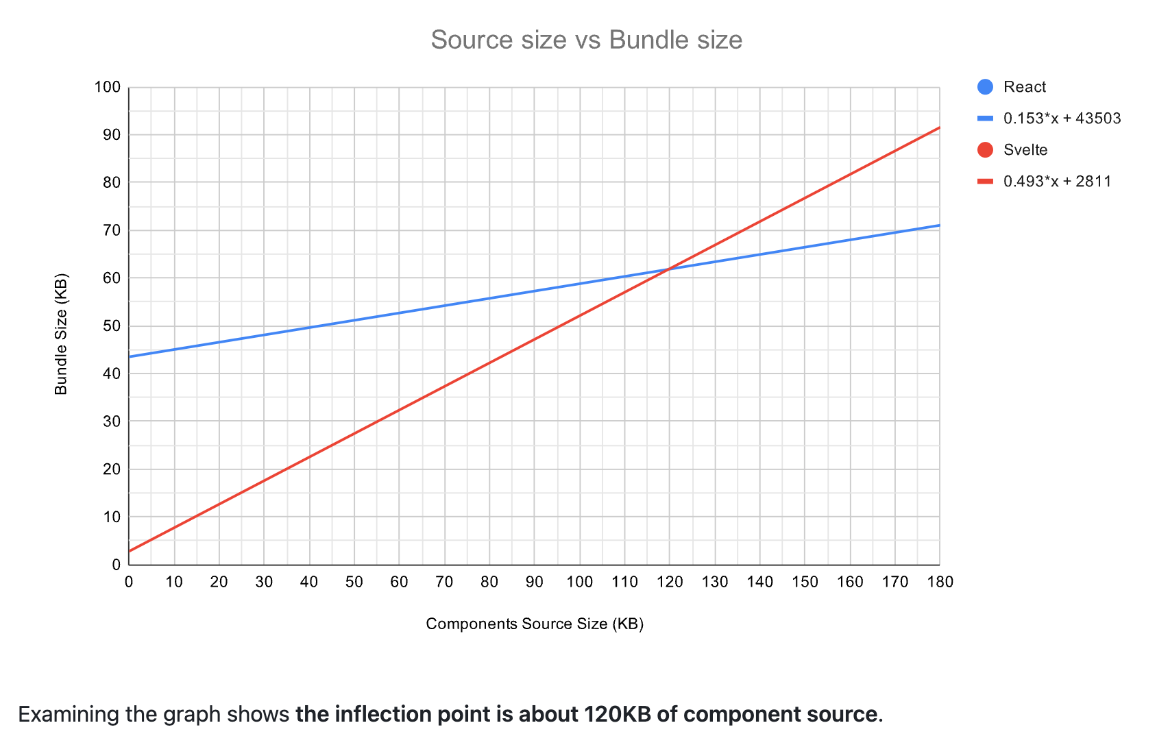 文章中指出,拐点约为 120KB 的组件源代码。即是说,在大约 120KB 时,使用编译器相对于运行时的大小优势已经消失了。但实际上,只要合理地使用代码分割,单文件出现120KB的情况是不太可能的。