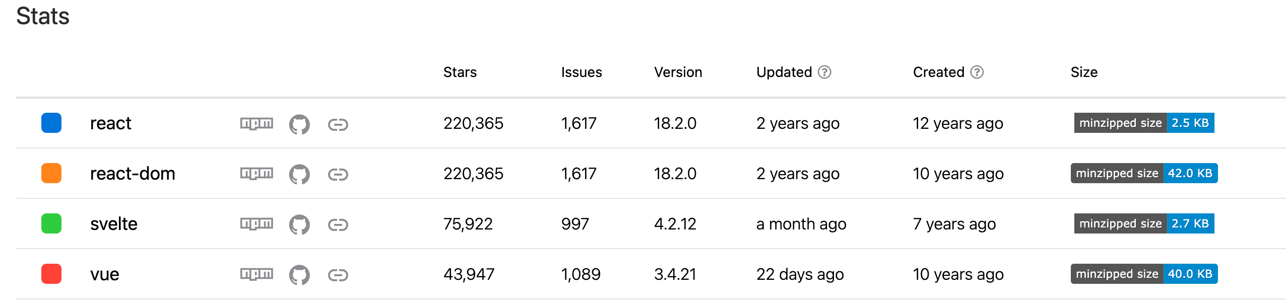 虽然Svelte在国外已经风靡数时,但其下载量目前仍然无法和Vue相比,对比第一梯队的React,更是难以望其项背。同样在国内的推广程度仍不够高。