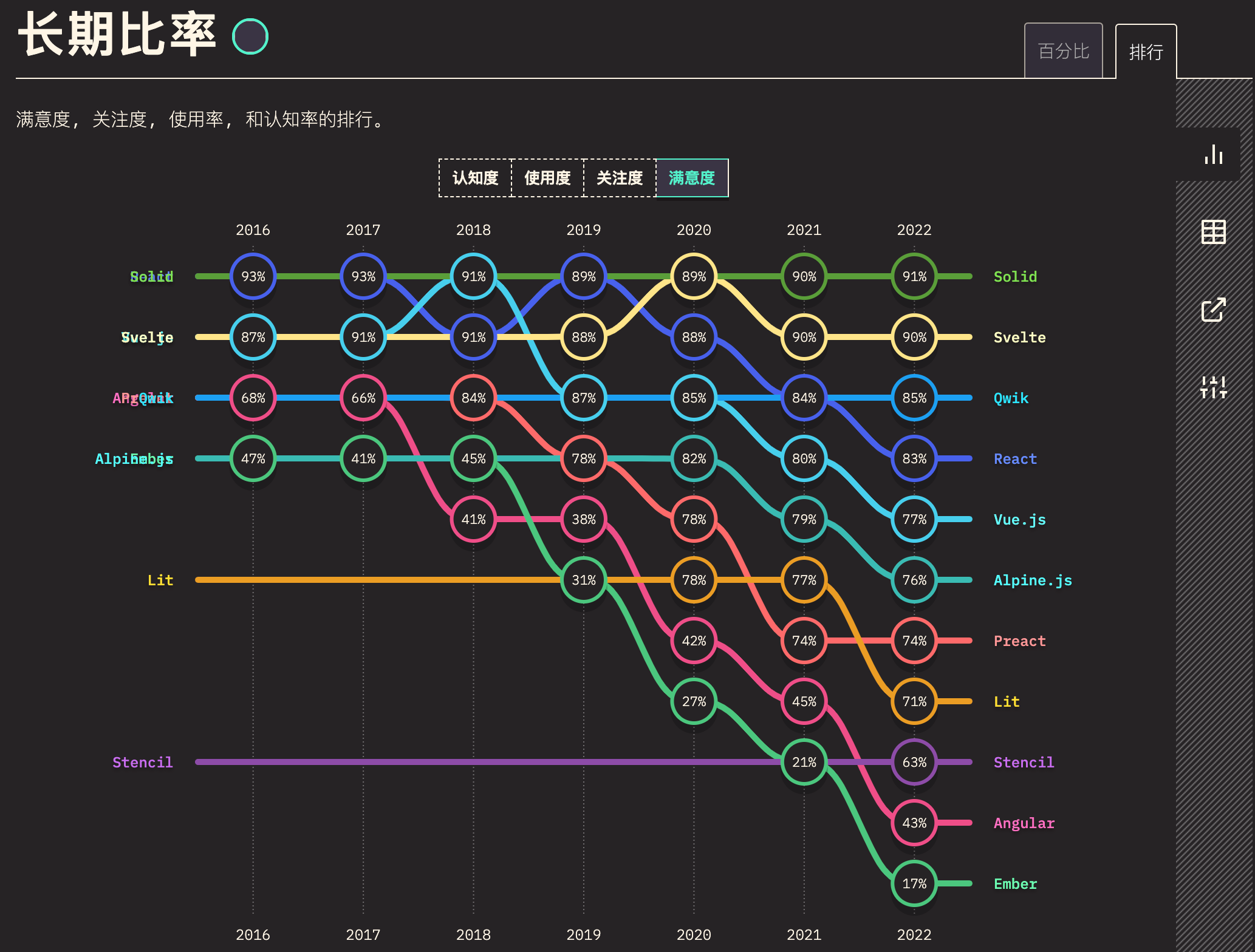 在stateofjs的2022年度报告中(笔者在写文章时2023年报告结果暂时未出),Svelte的关注度和满意度都名列前茅。