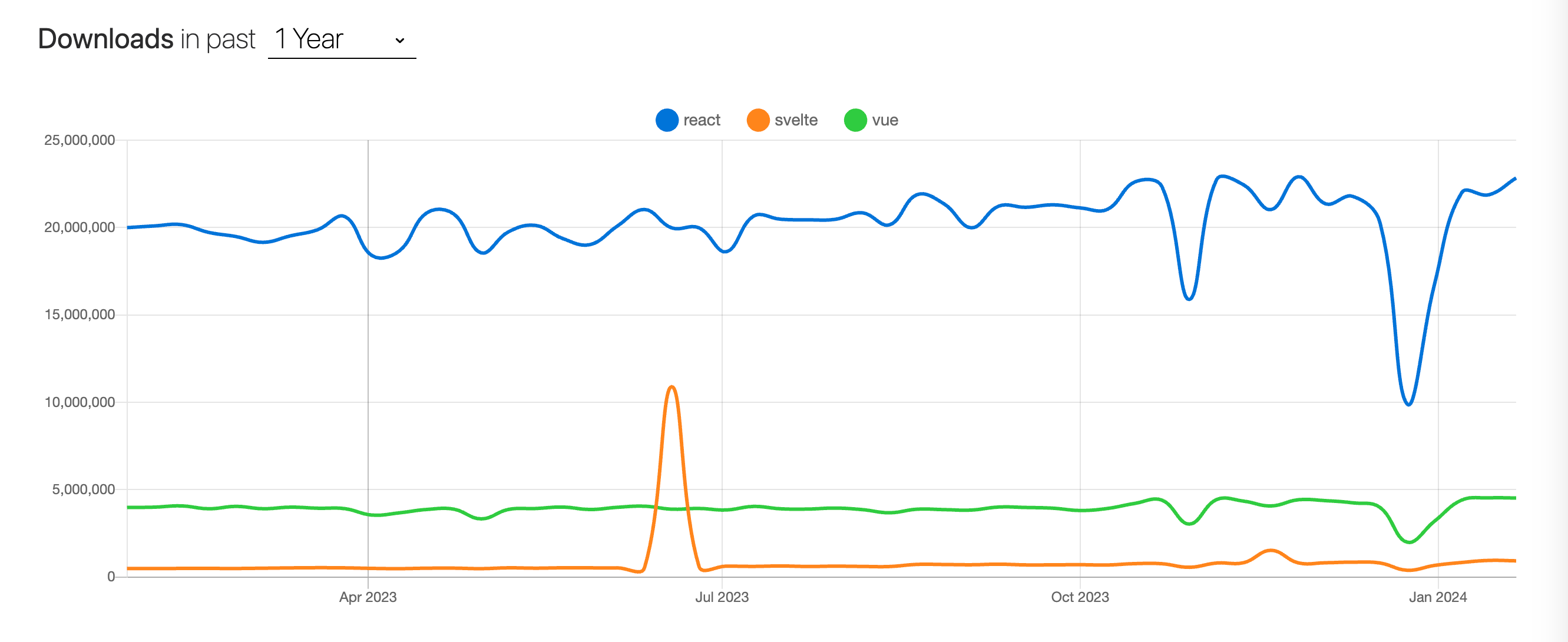 看一下三大框架在过去一年的下载量。