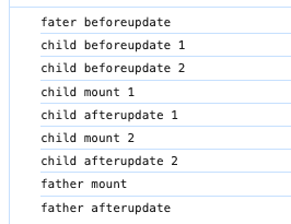当子组件的beforeUpdate执行完毕之后,再执行父组件的afterUpdate,最后执行子组件的afterUpdate。