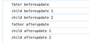 对于兄弟组件,beforeUpdate和afterUpdate依然是按照组件调用的顺序,从上往下执行。而对于父子组件,会先执行父组件的beforeUpdate,然后执行子组件的beforeUpdate。