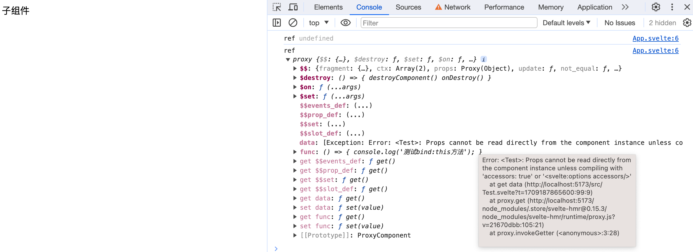我们可以看到,数据与方法都正常导出了。然而因为使用了export,原来的数据变成了一个prop属性,Svelte并不允许我们直接拿到这个属性。我们要么在<svelte:options>中做一些配置,要么就是我们在子组件内定义一个专门取数据的方法。