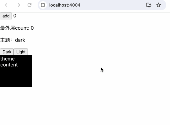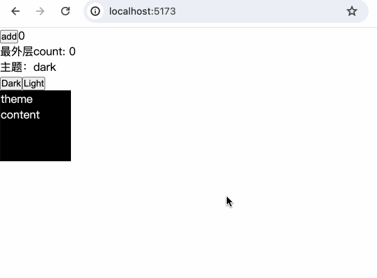 首先我们定义一个父组件,父组件内count变量用来测试在外层更改后,内层接收到的变量是否有更改,theme和setTheme变量用来测试传递到孙子组件的变量与方法是否生效。