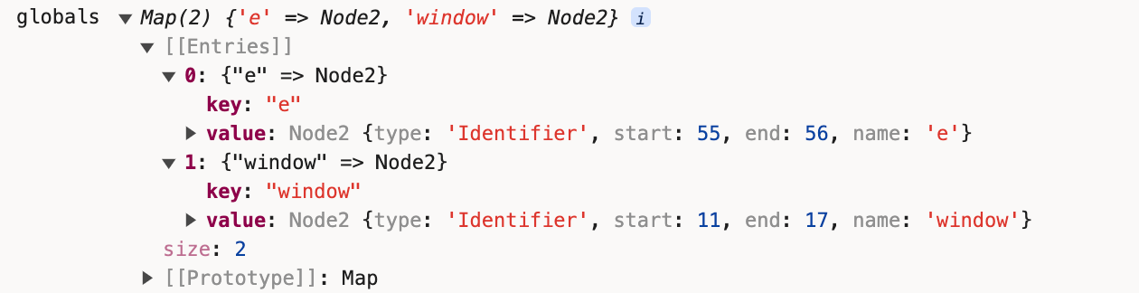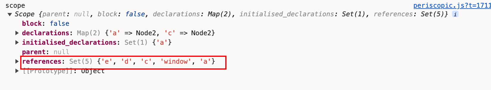 scope.block:如果scope是BlockStatement创建的,则是true,否则是falsescope.parent:父级的Scope对象scope.declarations:一个Map类型对象(Map<string, Node>),在当前scope中声明的所有变量,Node节点值是Declaration类型节点scope.initialised_declarations:一个Set类型对象(Set<string>),在当前scope中声明且初始化了的对象scope.references:一个Set类型对象(Set<string>),在当前scope中的所有变量名