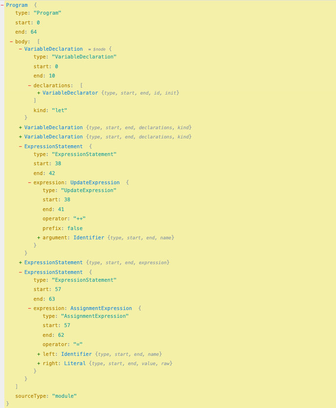 使用acorn解析之后得到的数据便是ast抽象语法树,树形结构的数据必然存在一个或多个叶子节点,在每个节点上,都有一个参数type来标记这个节点属于什么类型。我们了解一下在一个AST对象中的各种type的意义。
