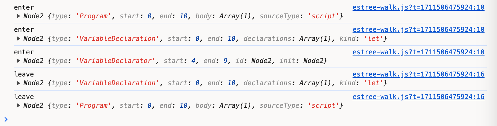 leave VariableDeclarator - VariableDeclaration的子节点也遍历完了,继续回退到上一级