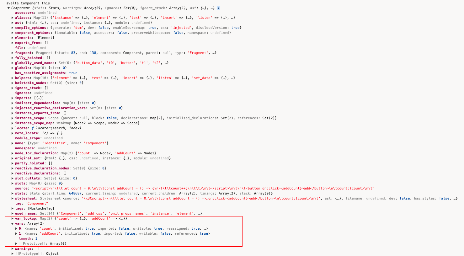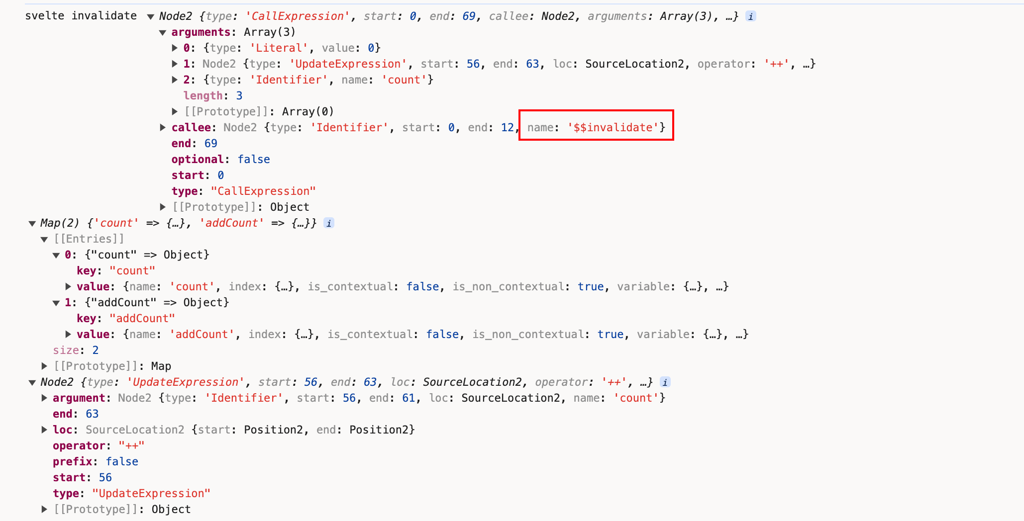 也就是我们点击按钮之后,会执行addCount方法,addCount内部的赋值语句已经被重新编译后,变成了$$invalidate()。