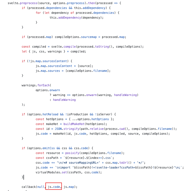 回看svelte-loader的代码,同样是返回js.code的代码。